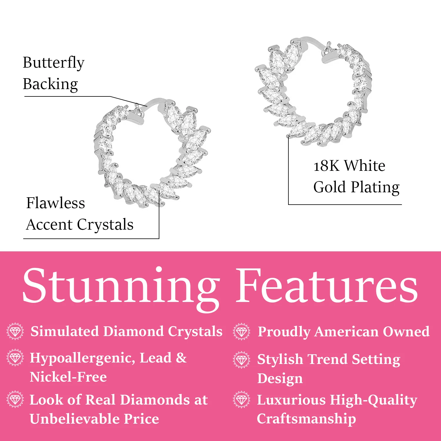 If you are looking to make a statement, then you are in the right place. These one of a kind sideways hoop earrings are unlike any other design you have seen and are sure to turn heads everywhere you go. The luxurious handset marquise cut shape Simulated Diamond Crystals beautifully wrap around your ear to give your outfit a pop you have been dreaming about for years.