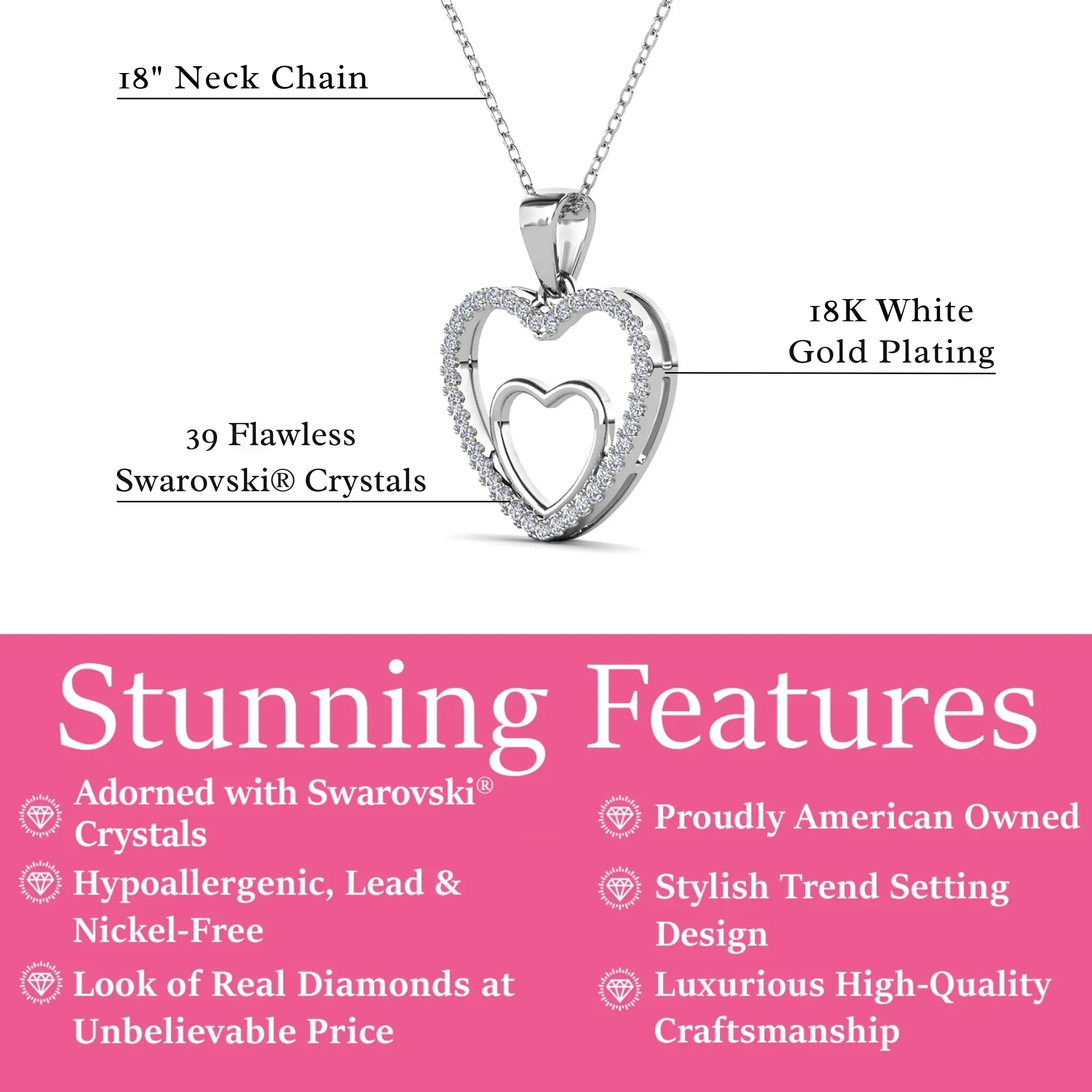 Amorette 18k White Gold Plated Double Heart Pendant Necklace with Pave Simulated Diamond Crystals