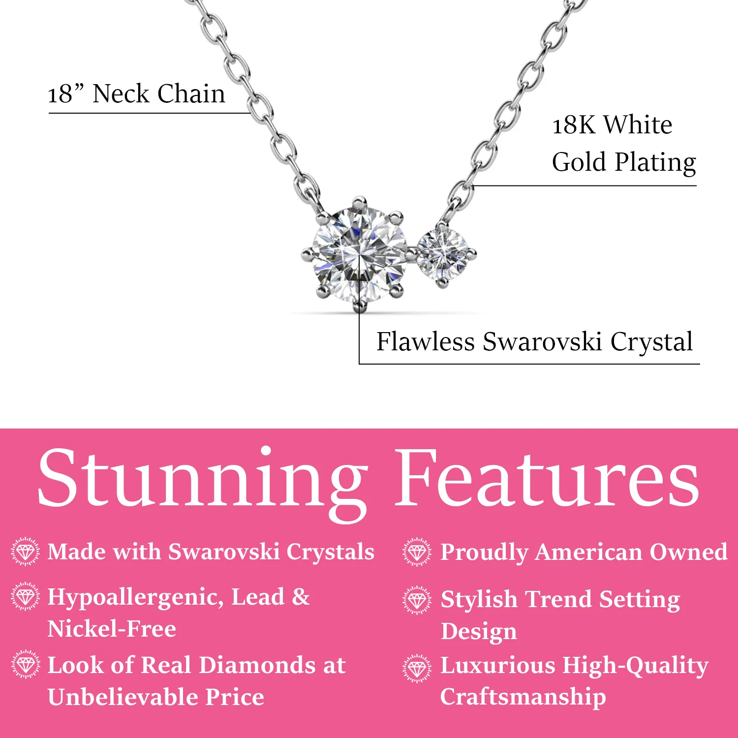 Radiate elegance with the captivating Emma 18k White Gold Plated 2-Stone Pendant Necklace. Designed to symbolize harmony and balance, this stunning piece features two brilliantly faceted Swarovski® crystals that sparkle beautifully with every movement. Crafted from hypoallergenic brass and plated in luxurious 18k white gold, the Emma necklace blends timeless sophistication with modern charm.