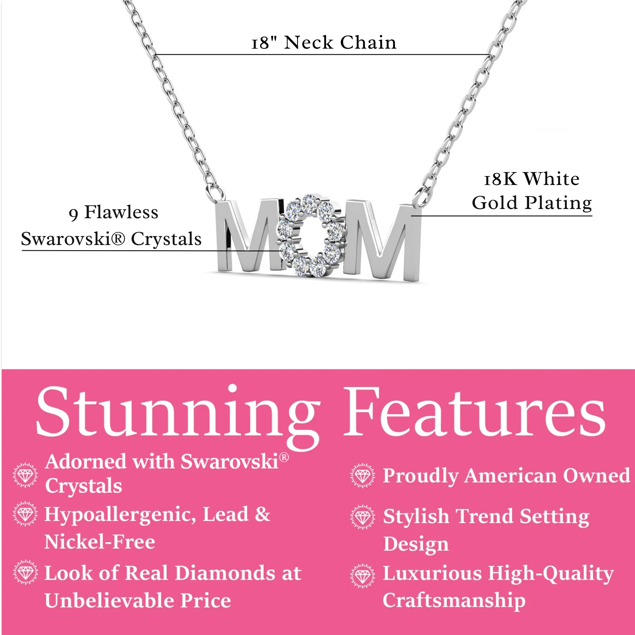 The Savannah Mom Necklace combines modern elegance with heartfelt sentiment. Featuring the word "MOM" adorned with sparkling Swarovski® crystals, this necklace shines with subtle sophistication. The 18k white gold plating over hypoallergenic brass adds a radiant finish that complements any outfit.