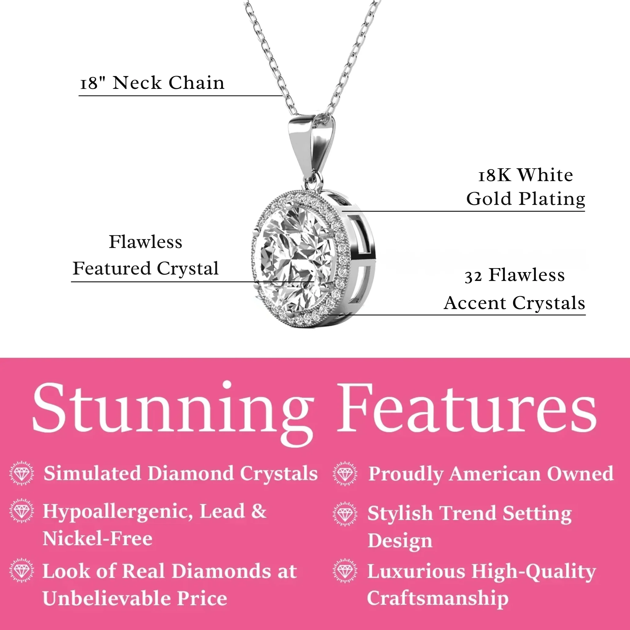 Sophia 18k White Gold Plated Pendant Necklace with Simulated Diamond Crystals - Designed with women in mind, this 18k white gold plated necklace showcases a halo design embellished with meticulously crafted round-cut crystals that glisten with precision.
